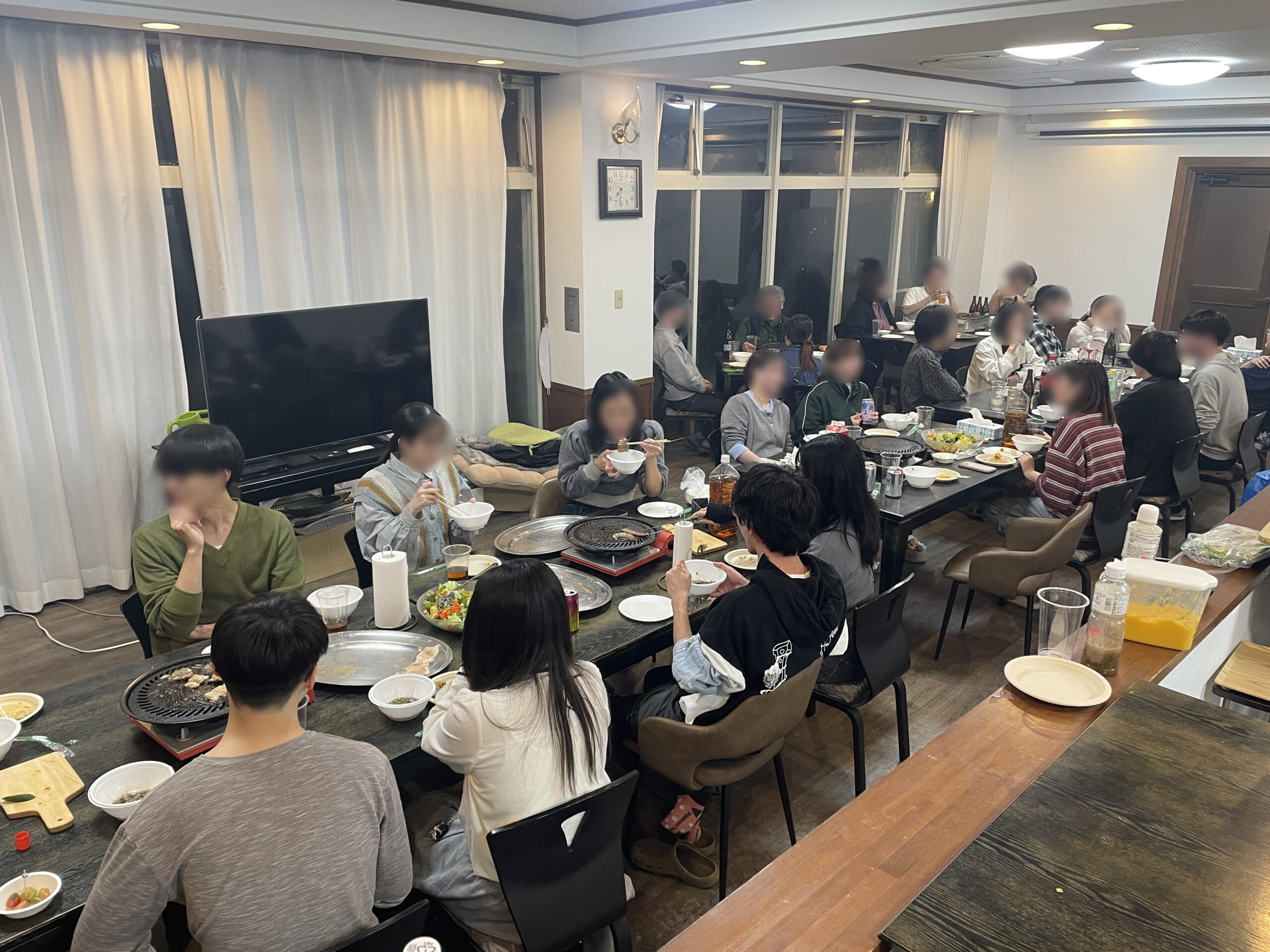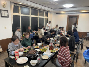 今回は雨だったので室内で総勢30名での大宴会! 吉祥寺のお店からお肉を持って来て、調理してくれた大将に感謝!!