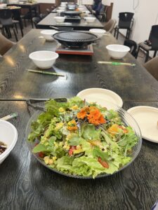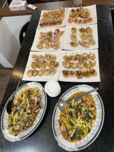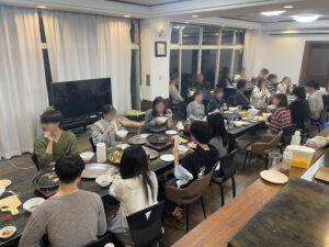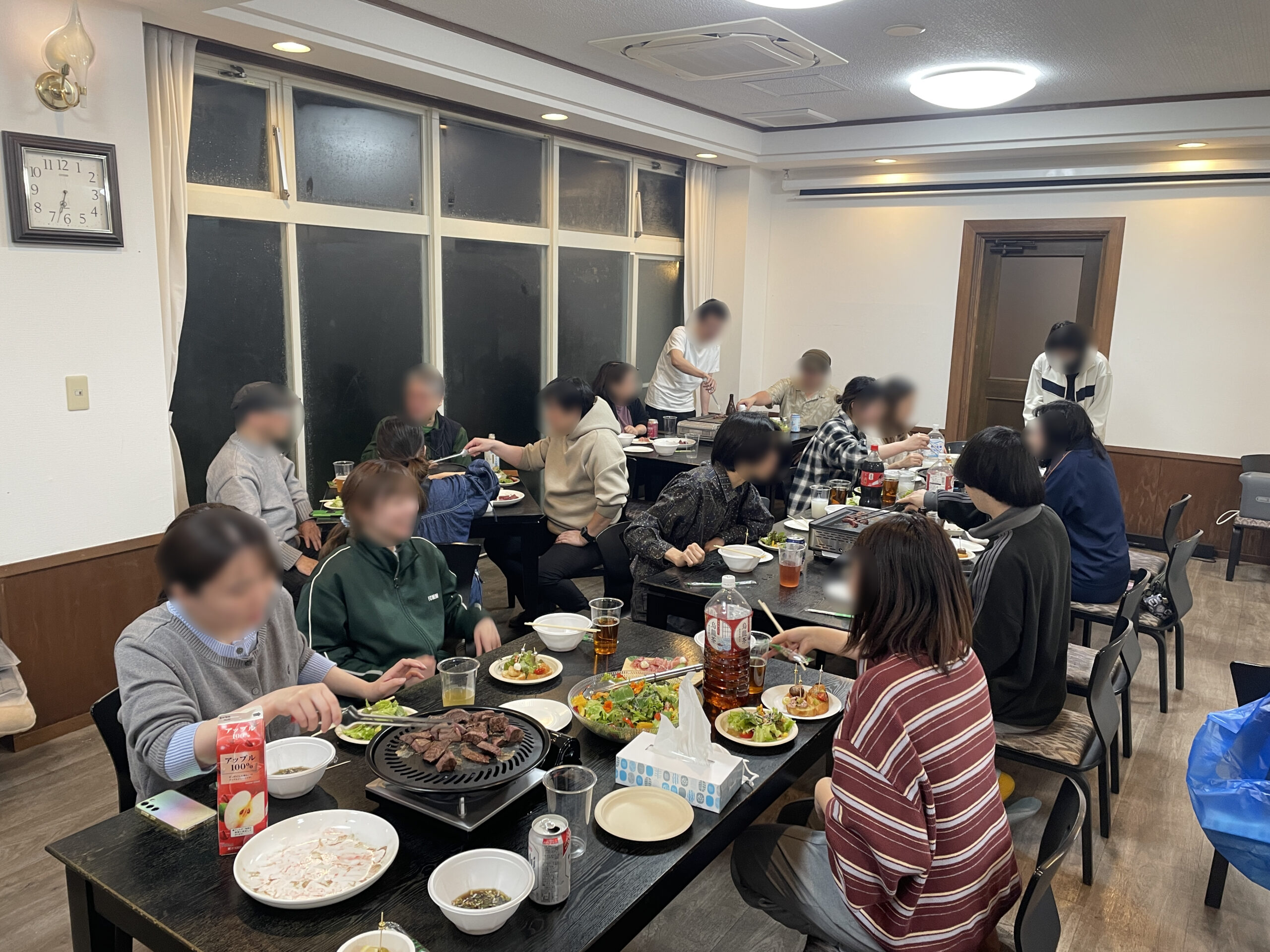 新人、先輩が一緒に料理や洗い物をしてからの歓迎会! 今回はメインの焼肉にバゲットピンチョスとサラダ、デザートにパンナコッタです。